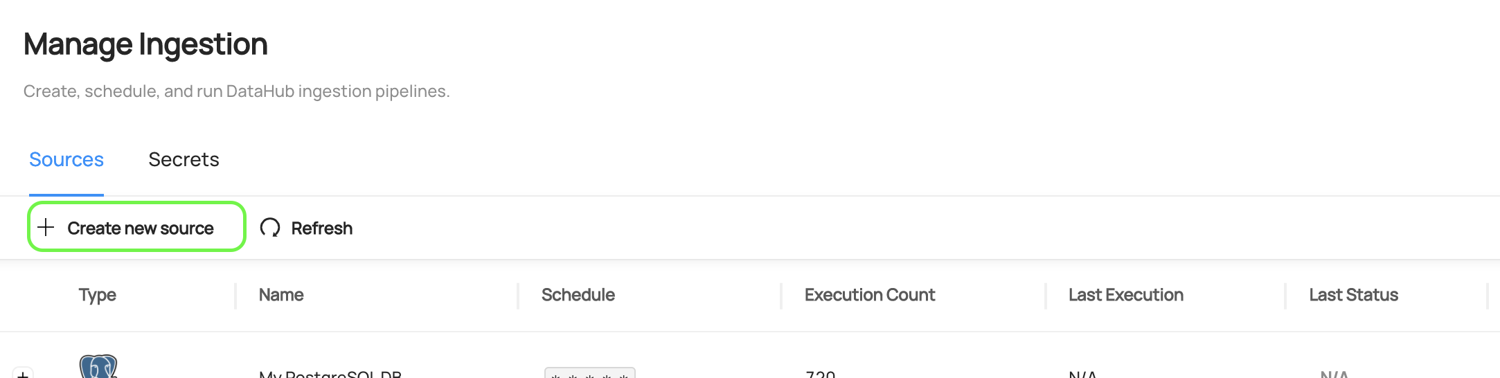 Before ingesting any metadata, you need to create a new Ingestion Source. Start by clicking + Create new source.
