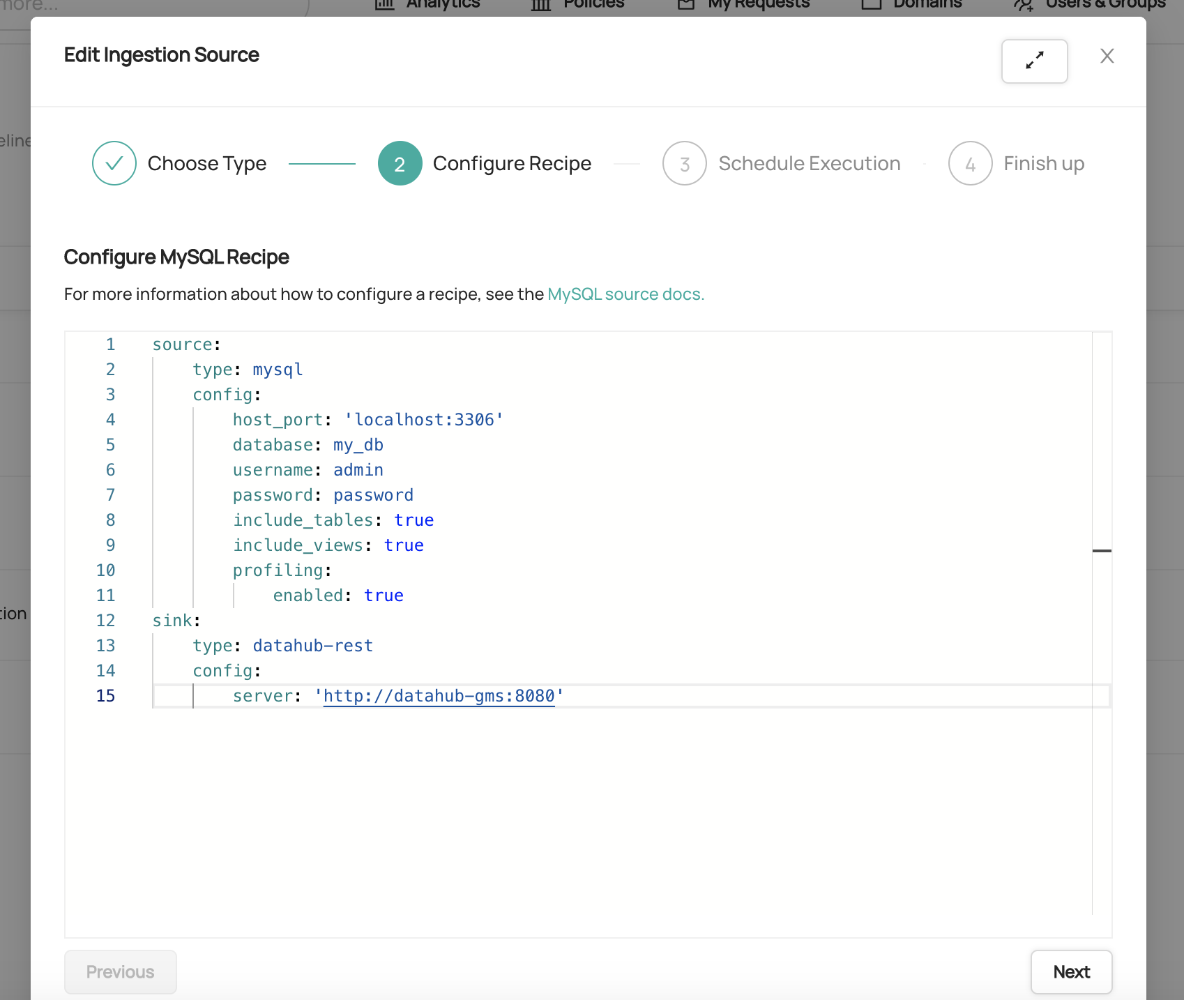 A sample of a full recipe configured to ingest metadata from MySQL can be found in the image below.