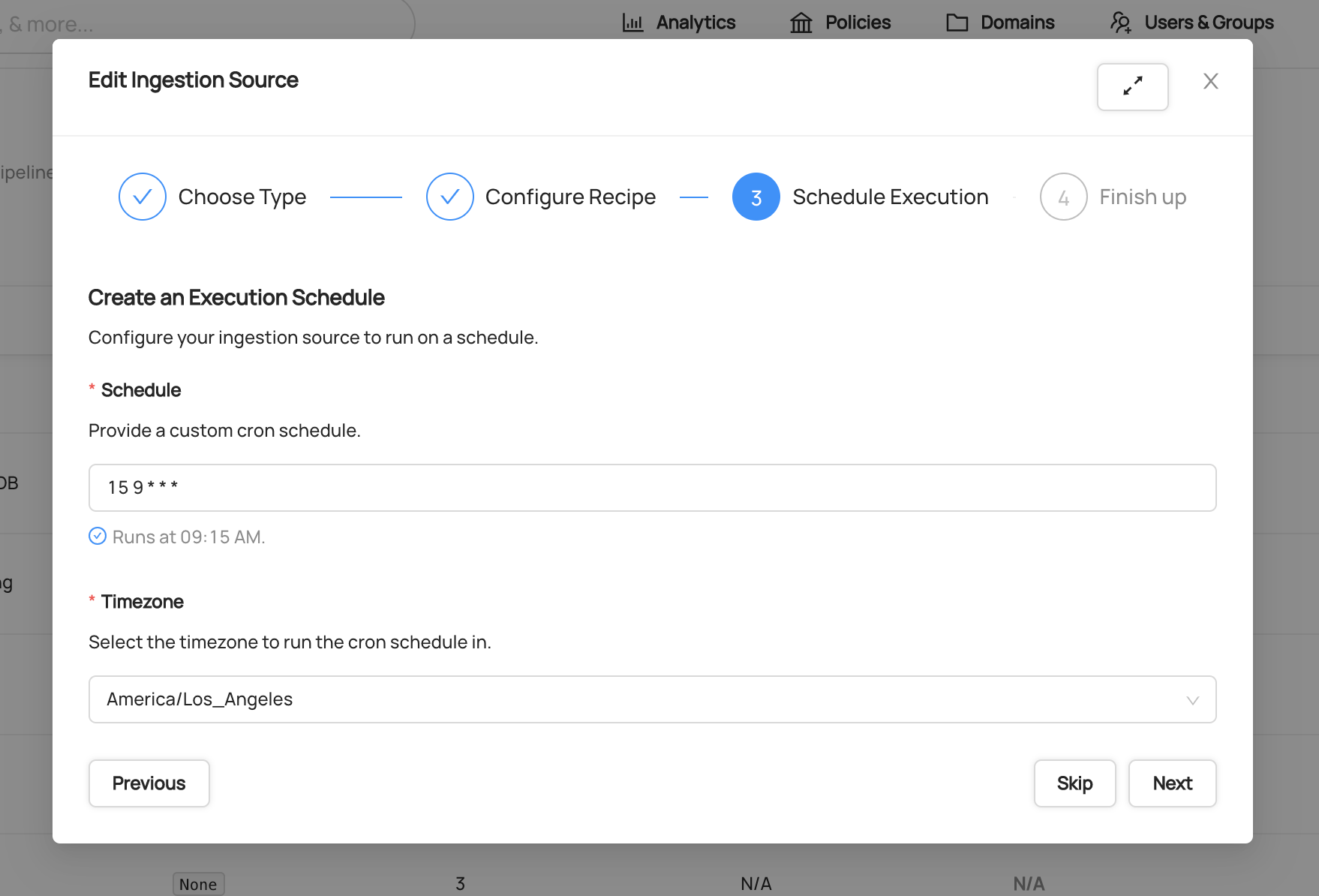 If you plan to execute ingestion on an ad-hoc basis, you can click Skip to skip the scheduling step entirely. Don't worry - you can always come back and change this.